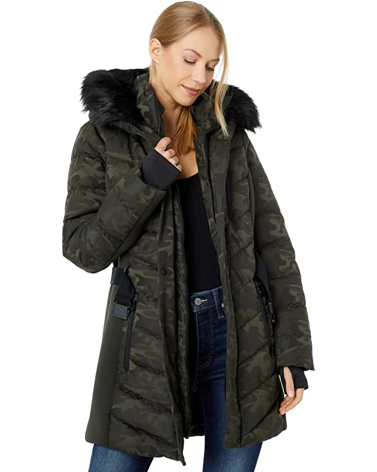 - Faux fur trimmed stand collar has removable hood with snap buttons and bungee closure.